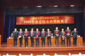 12月26日,秦皇島宏岳塑膠有限公司2008年度總結表彰暨聯歡會在開發區管委報告廳拉開帷幕,宏岳全體員工600余人整齊著裝,歡聚一堂。