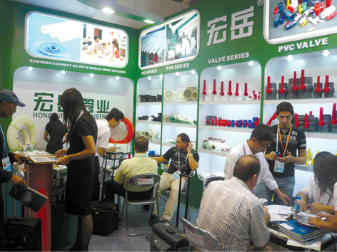 在本屆廣交會期間,來自歐洲、南美、北美、中東、非洲、東南亞等世界各地的眾多客商站在宏岳的展位前,拿起精致的宏岳MacroAlp系列PPR管材管件,詢問不停;更多的客戶對宏岳齊全的PPR、PVC球閥系列產品包括八角球閥、內螺紋球閥、銅芯球閥、組裝閥、蝶閥等紛紛帶走樣品,購買意向非常明確,另外許多用戶在5天展期內在貨比多家后,多次來到展位前洽談購買細節,最終簽訂合作協議,不但證明了宏岳產品的優秀品質得到了客戶和市場的檢驗,同時極大的鼓舞了外貿部所有人員的工作激情和斗志。