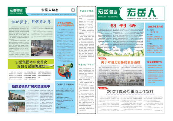 為了豐富公司企業(yè)文化,提升企業(yè)形象,給所有宏岳人提供一個(gè)相互交流,展現(xiàn)自我的平臺(tái),《宏岳人》內(nèi)刊在宏岳全體員工的矚目中出版啦,在《宏岳人》內(nèi)刊中,企業(yè)文化宣傳欄,創(chuàng)建我們宏岳人獨(dú)有的企業(yè)文化,公司最新新聞動(dòng)態(tài)簡(jiǎn)訊,讓大家更好地了解公司動(dòng)態(tài),有集團(tuán)內(nèi)容的經(jīng)驗(yàn)交流,有員工創(chuàng)優(yōu)爭(zhēng)先的先進(jìn)事跡,有工作經(jīng)驗(yàn)的交流,有健康關(guān)愛(ài)的小知識(shí),有安全生產(chǎn)小常識(shí),有更多我們宏岳人關(guān)心的熱點(diǎn),在這里我們宏岳人相互的交流,相互傾訴,分享喜悅,分享知識(shí),分享收獲。《宏岳人》內(nèi)刊就是我們宏岳人自己的報(bào)刊,對(duì)弘揚(yáng)企業(yè)文化,增強(qiáng)團(tuán)隊(duì)凝聚力的作用;相信我們《宏岳人》會(huì)越辦越好。