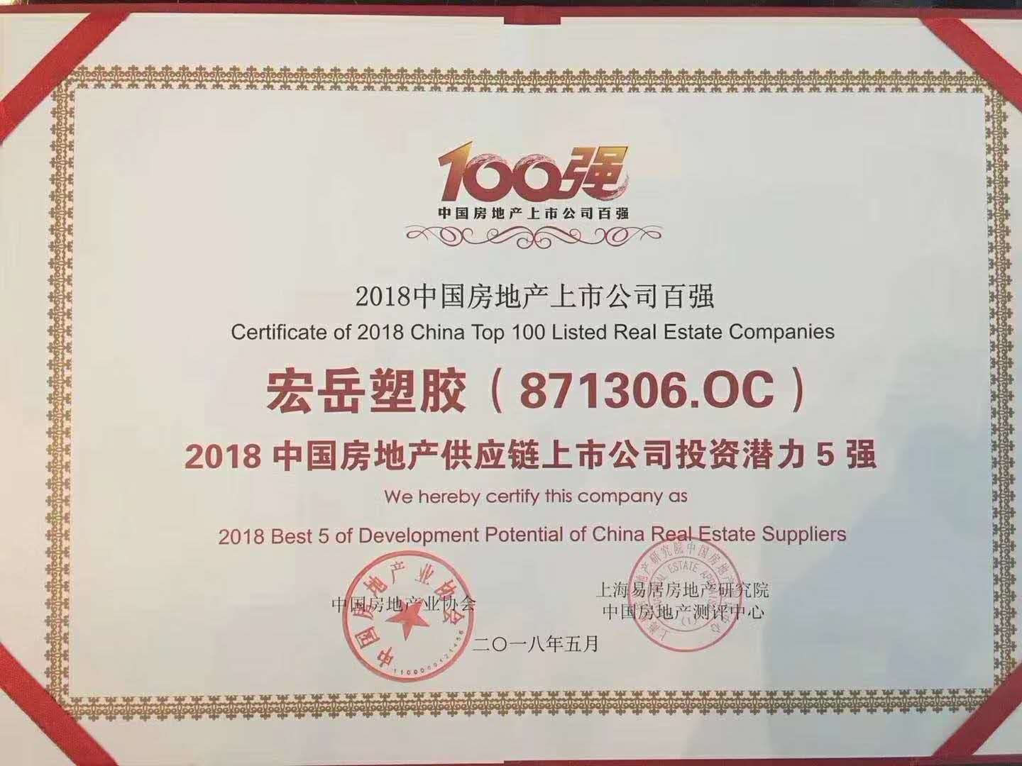 由中國房地產業協會、上海易居房地產研究院中國房地產測評中心聯合開展的“2018中國房地產上市公司測評成果發布會暨金融創新高峰論壇”在深圳舉行,宏岳榮獲“2018中國房地產供應鏈上市公司投資潛力5強”。