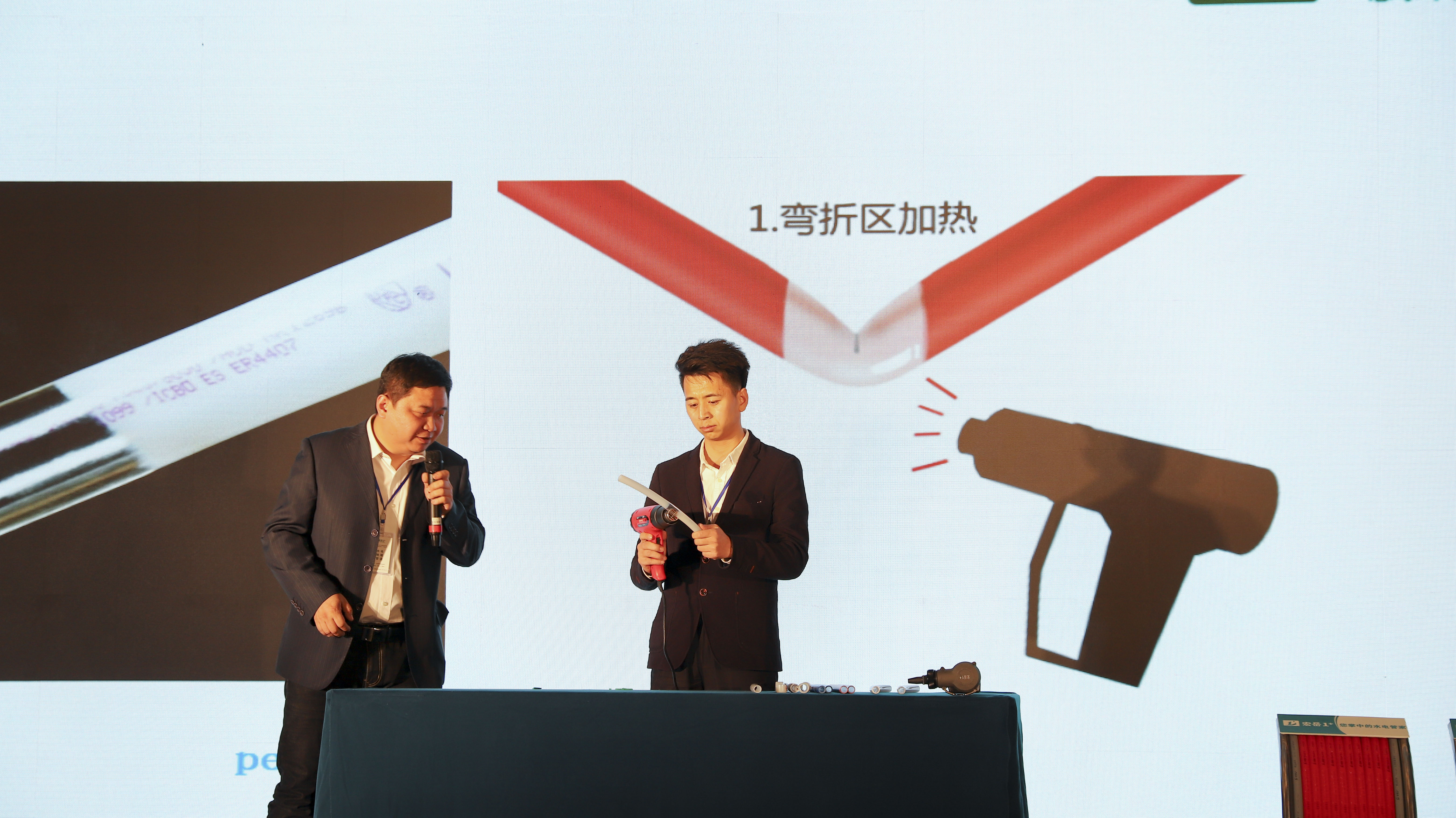 重點提出宏岳1+PE-Xa給水系統較目前市場主流給水系統降低70%的風險點,耐壓高67%,耐溫高32%,會上通過現場實驗,展現了PE-Xa給水管超強的記憶功能,應對變形折傷加熱即可無損復原。