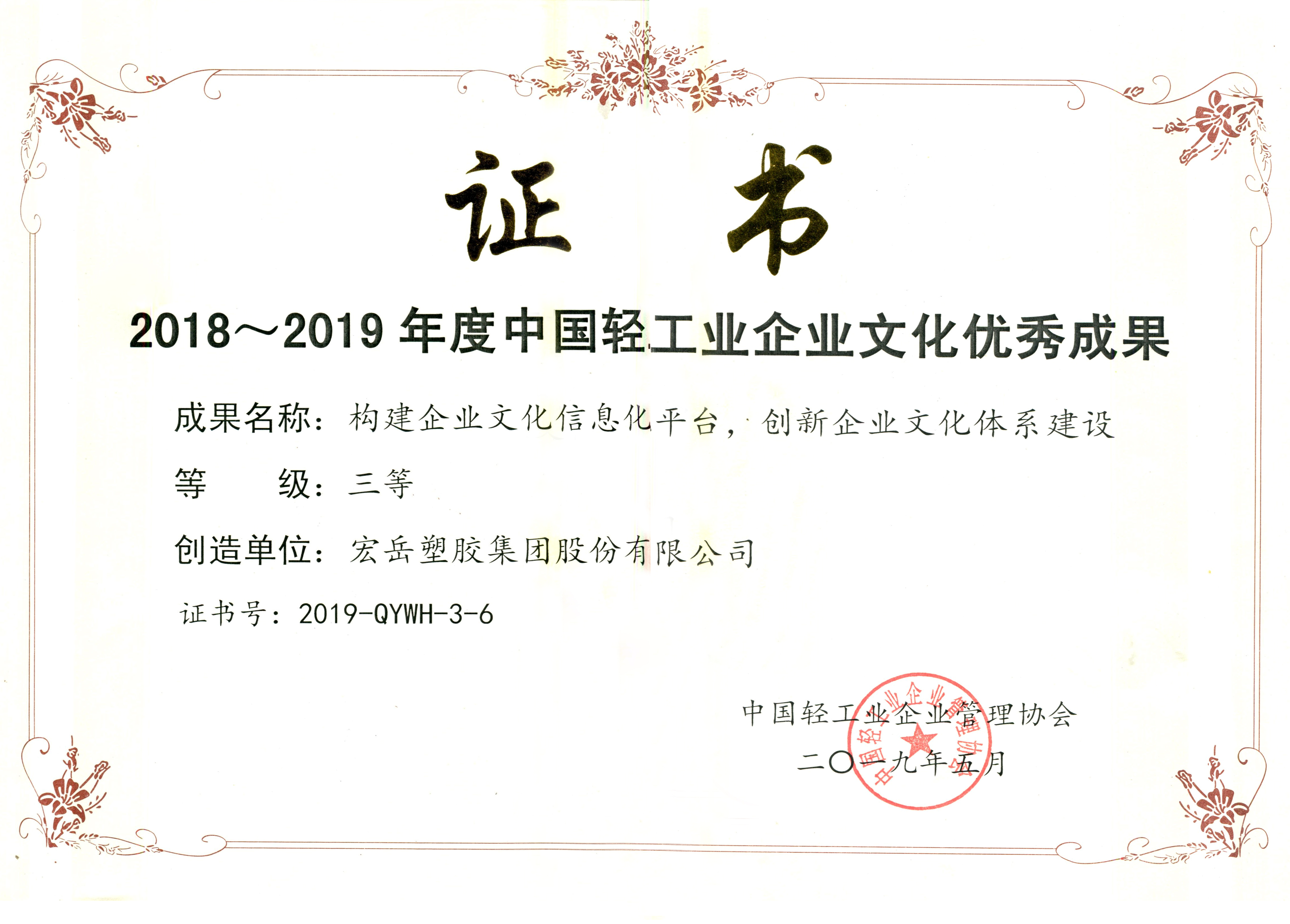 5月17日,中國輕工業企業管理協會第四屆第五次理事(擴大)會議暨2019年輕工業企業文化建設經驗交流會在鄭州召開,宏岳集團申報的“構建企業文化信息化平臺,創新企業文化體系建設”項目成果榮獲2018~2019年度中國輕工行業企業文化優秀成果三等獎。