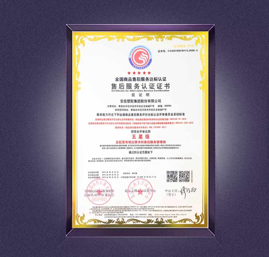 8月22日,宏岳塑膠集團股份有限公司通過全國商品售后服務達標認證,獲得五星級售后服務認證證書。