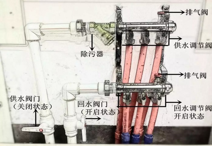 2、關(guān)閉地暖分集水器各環(huán)路調(diào)節(jié)閥