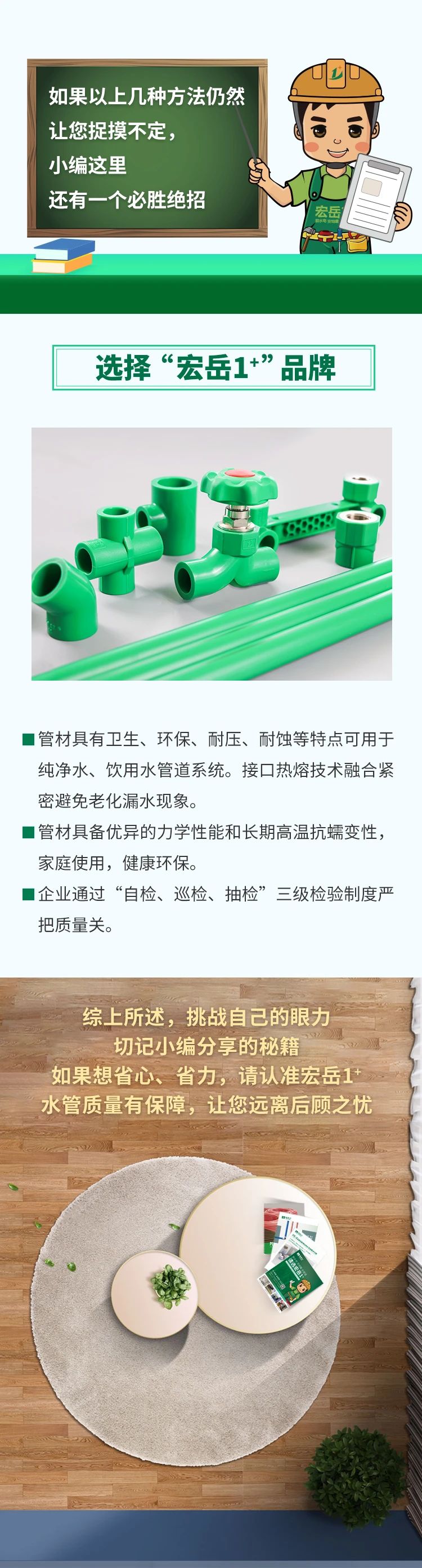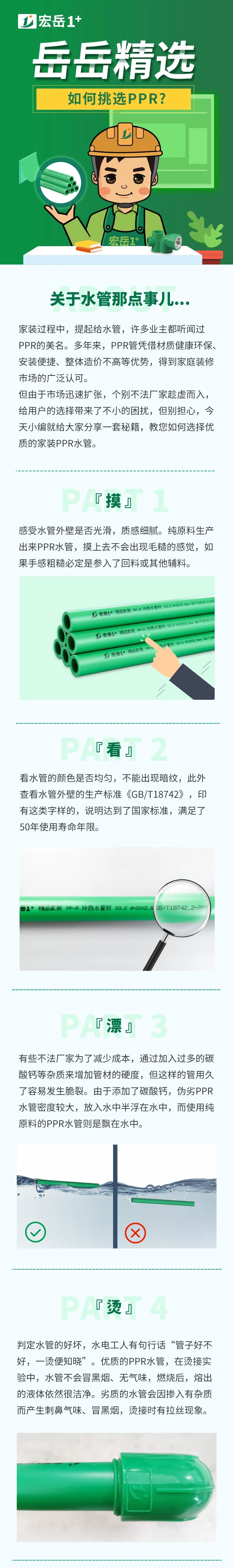 家裝過程中,提起給水管,許多業(yè)主都聽聞過PPR的美名。多年來,PPR管憑借材質(zhì)健康環(huán)保、安裝便捷、整體造價不高等優(yōu)勢,得到家庭裝修市場的廣泛認可。今天宏岳就給大家分享一套秘籍,教您如何選擇優(yōu)質(zhì)的家裝PPR水管。