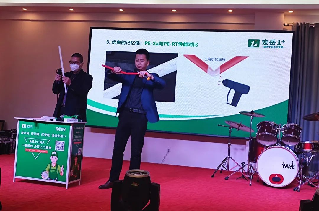 實踐是檢驗技術的唯一標準,宏岳1+華北區域運營經理李超攜團隊將各種新品與技術應用帶到現場,向各位參會者詳實介紹了宏岳1+產品體系并著重介紹了PE-Xa快易給水系統的優勢特點及施工工藝,現場通過實物實例及趣味游戲,充分地展示了宏岳1+產品的技術先進性和質量可靠性,尤其是PE-Xa管路便捷的連接方式和安全的產品性能,引起了現場嘉賓的高度關注
