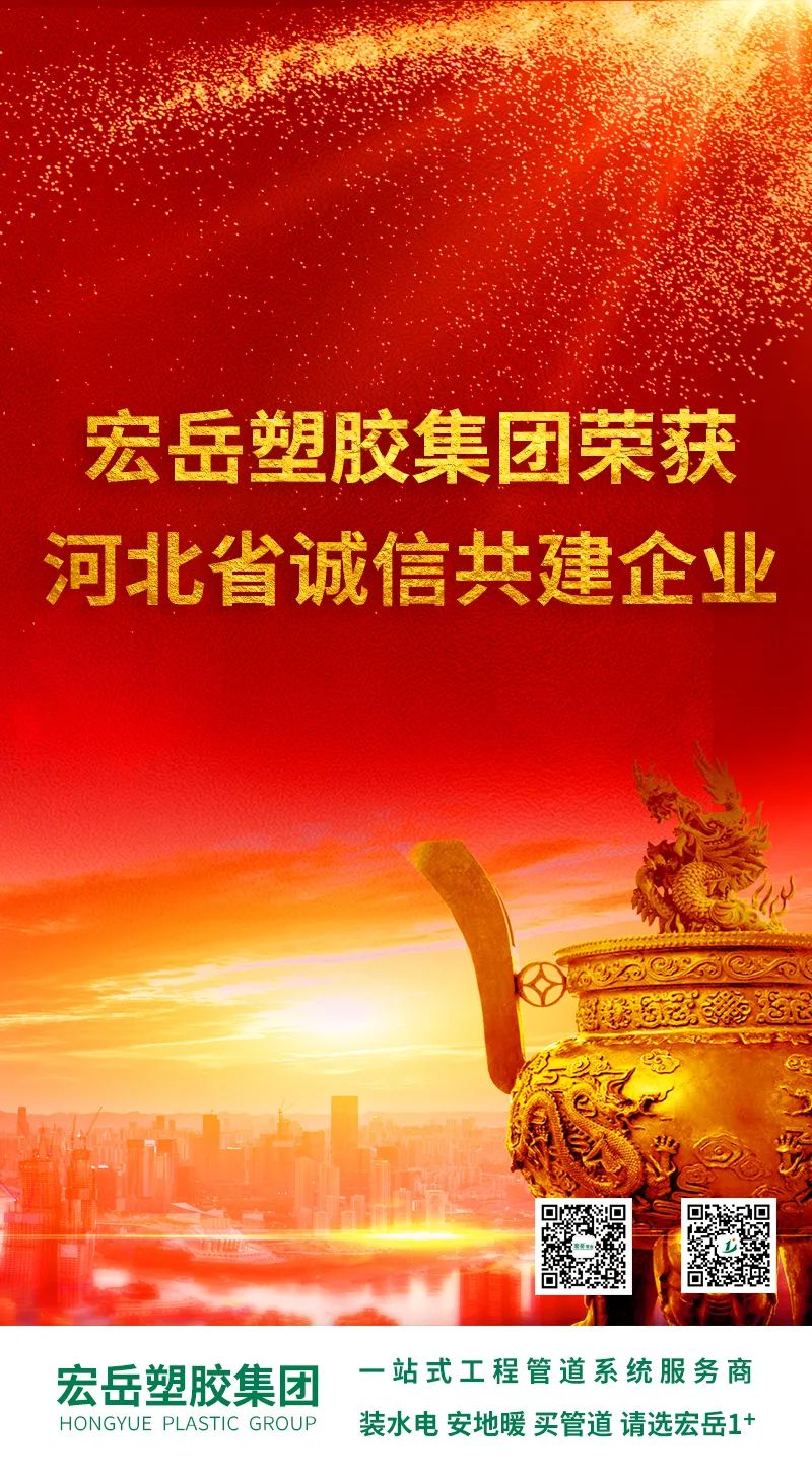 近日,宏岳塑膠集團榮獲“河北省誠信共建企業”稱號,秉承“誠·信·實”的核心價值觀,宏岳堅守初心,以產品質量為信用基石,以誠信經營為發展理念,持續創新,永續發展!