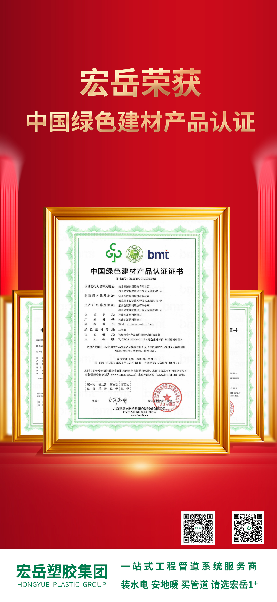 宏岳獲得中國綠色建材產(chǎn)品認(rèn)證,本次認(rèn)證對(duì)PPR、PVC、PE、PE-Xa、PE-RT管材管件等11個(gè)單元的系列產(chǎn)品,以環(huán)保、節(jié)能、節(jié)水、循環(huán)、低碳等評(píng)價(jià)維度進(jìn)行了相關(guān)審核,宏岳集團(tuán)順利通過。